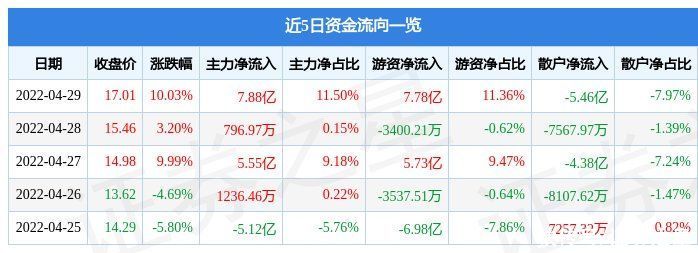 资金流向数据方面,4月29日主力资金净流入7.88亿元,游资资金净流入7.78亿元,散户资金净流出5.46亿元。