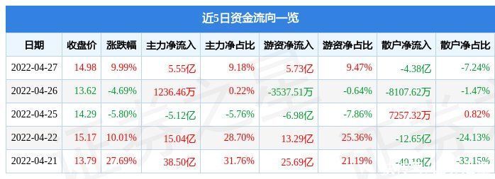 资金流向数据方面,4月27日主力资金净流入5.55亿元,游资资金净流入5.73亿元,散户资金净流出4.38亿元。